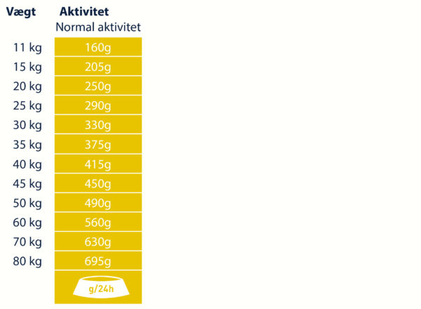 Giv foderet tør eller tilføj frisk, varmt vand (ved omkring 50-60° C) og lad det trække i et par minutter. Sørg for, at der er frisk drikkevand til rådighed på alle tidspunkter. Reducer mængden af foder, hvis du også giver din hund snacks/godbidder. I betragtning af forskellen mellem de enkelte hunde, kan den angivne daglige mængde reduceres med op til 15 %, hvis hunden har tendens til at være overvægtig.