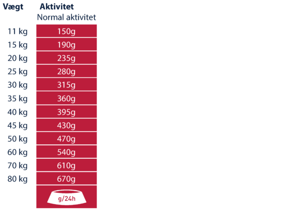 Giv foderet tør eller tilføj frisk, varmt vand (ved omkring 50-60° C) og lad det trække i et par minutter. Sørg for, at der er frisk drikkevand til rådighed på alle tidspunkter. Reducer mængden af foder, hvis du også giver din hund snacks/godbidder. I betragtning af forskellen mellem de enkelte hunde, kan den angivne daglige mængde reduceres med op til 15 %, hvis hunden har tendens til at være overvægtig.