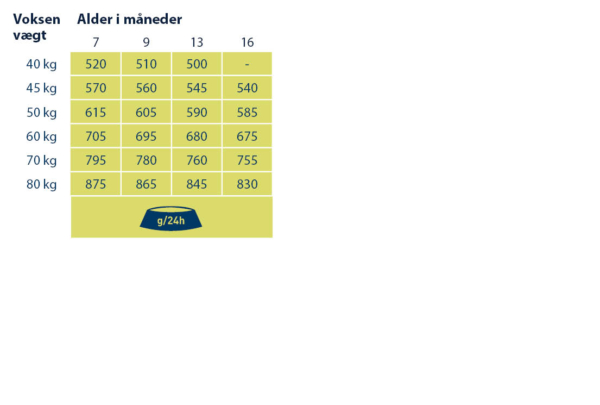 Alderen er angivet i uger (uger) eller måneder (måneder). Mængden af foder er pr. dag og bør fordeles over flere måltider. Giv foderet tør eller tilføj frisk, varmt vand (ved omkring 50-60° C) og lad det trække i et par minutter. Sørg for, at der er frisk drikkevand til rådighed på alle tidspunkter. Reducer mængden af foder, hvis du også giver din hund snacks/godbidder. I betragtning af de metaboliske forskelle mellem de enkelte hunde, kan den angivne daglige mængde reduceres med op til 15 %, hvis hunden har tendens til at være overvægtig. Sikre du ikke foder for meget – opmærksomhed på den moderate vækst. Efter den 18. måned bør der langsomt skiftes til et Happy Dog voksen foder, for eksempel “Happy Dog Superme Sensible Neuseeland“.