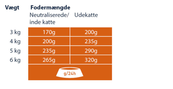 Sørg for, at der er frisk drikkevand til rådighed på alle tidspunkter, i en god afstand fra foderskålen. I betragtning af forskellen mellem de enkelte katte, kan den angivne daglige mængde reduceres med op til 15 %. Opdel den daglige mængde af foder, i flere måltider.