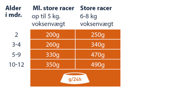 Anbefalet daglig fodermængde ved eksklusiv fodring. 1 pose svarer til cirka 20 g tørfoder. Det individuelle behov afhænger af alder, race og aktivitetsniveau. Sørg altid for friskt vand i en skål, der står væk fra madskålen. Servér ved stuetemperatur. Vej killinger regelmæssigt og dokumenter vægtudviklingen. Opdel den daglige fodermængde i flere måltider. Skift til en passende Happy Cat voksenfoder fra 12. måned.