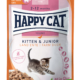 “Happy Cat kød i sovs” til killinger og juniorkatte er tilberedt med kød af høj kvalitet. Den letfordøjelige og kornfri opskrift med fjerkræ er nøje tilpasset behovene hos små killinger. Det velsmagende fuldfoder indeholder alt, hvad killingen har brug for og bidrager naturligt til kroppens immunforsvar.