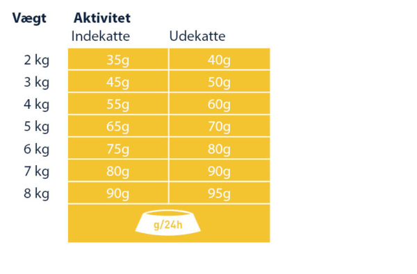 Sørg for, at der er frisk drikkevand til rådighed på alle tidspunkter, i en god afstand fra foderskålen. I betragtning af forskellen mellem de enkelte katte, kan den angivne daglige mængde reduceres med op til 15 %. Opdel den daglige mængde af foder, i flere måltider.
