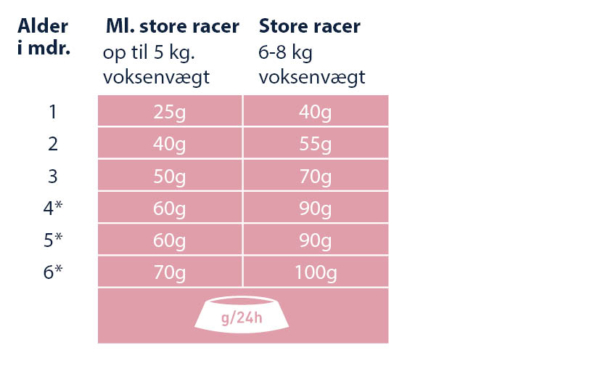 Sørg for, at der er frisk drikkevand til rådighed på alle tidspunkter, i en god afstand fra foderskålen. I betragtning af forskellen mellem de enkelte katte, kan den angivne daglige mængde reduceres med op til 15 %. Opdel den daglige mængde af foder, i flere måltider. Senest efter den 6. måned skiftes til Minkas Junior Care eller et andet passende Happy Cat junior foder.
