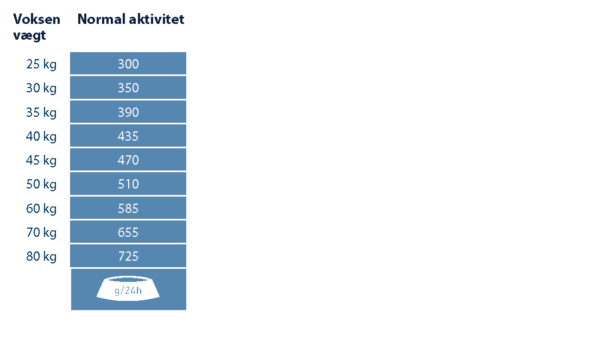 Giv foderet tør eller tilføj frisk, varmt vand (ved omkring 50-60° C) og lad det trække i et par minutter. Sørg for, at der er frisk drikkevand til rådighed på alle tidspunkter. Reducer mængden af foder, hvis du også giver din hund snacks/godbidder. I betragtning af forskellen mellem de enkelte hunde, kan den angivne daglige mængde reduceres med op til 15 %, hvis hunden har tendens til at være overvægtig.
