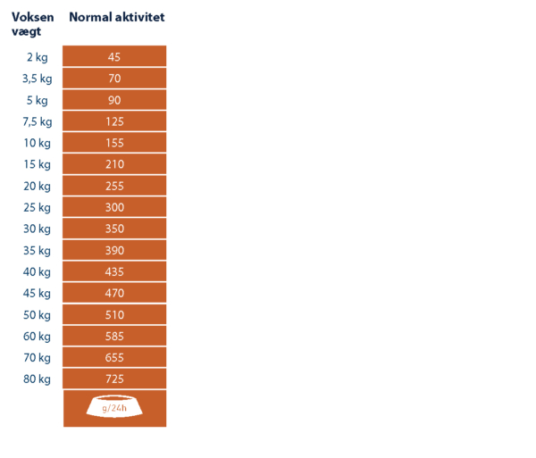 Giv foderet tør eller tilføj frisk, varmt vand (ved omkring 50-60° C) og lad det trække i et par minutter. Sørg for, at der er frisk drikkevand til rådighed på alle tidspunkter. Reducer mængden af foder, hvis du også giver din hund snacks/godbidder. I betragtning af forskellen mellem de enkelte hunde, kan den angivne daglige mængde reduceres med op til 15 %, hvis hunden har tendens til at være overvægtig.