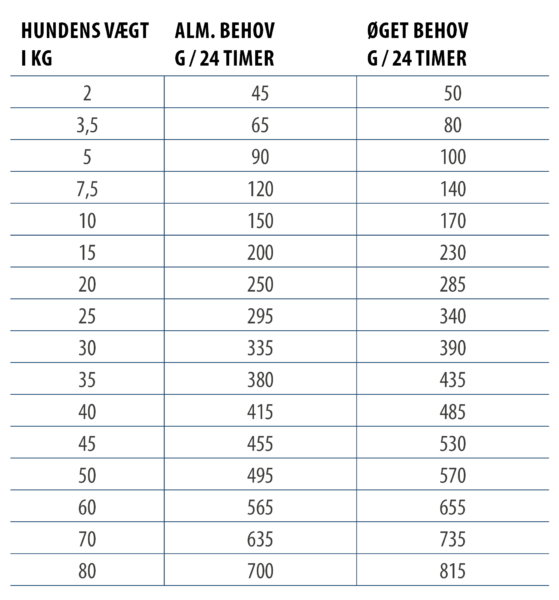 Giv foderet tør eller tilføj frisk, varmt vand (ved omkring 50-60° C) og lad det trække i et par minutter. Sørg for, at der er frisk drikkevand til rådighed på alle tidspunkter. Reducer mængden af foder, hvis du også giver din hund snacks/godbidder. I betragtning af forskellen mellem de enkelte hunde, kan den angivne daglige mængde reduceres med op til 15 %, hvis hunden har tendens til at være overvægtig.