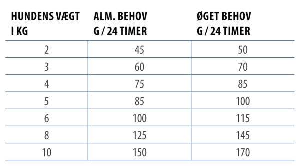 Giv foderet tør eller tilføj frisk, varmt vand (ved omkring 50-60° C) og lad det trække i et par minutter. Sørg for, at der er frisk drikkevand til rådighed på alle tidspunkter. Reducer mængden af foder, hvis du også giver din hund snacks/godbidder. I betragtning af forskellen mellem de enkelte hunde, kan den angivne daglige mængde reduceres med op til 15 %, hvis hunden har tendens til at være overvægtig.