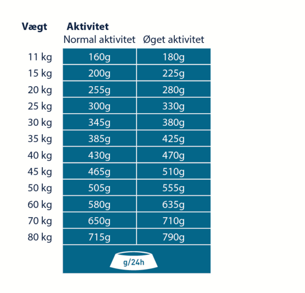 Giv foderet tør eller tilføj frisk, varmt vand (ved omkring 50-60° C) og lad det trække i et par minutter. Sørg for, at der er frisk drikkevand til rådighed på alle tidspunkter. Reducer mængden af foder, hvis du også giver din hund snacks/godbidder. I betragtning af forskellen mellem de enkelte hunde, kan den angivne daglige mængde reduceres med op til 15 %, hvis hunden har tendens til at være overvægtig.