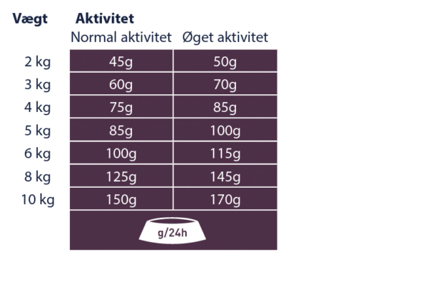 Giv foderet tør eller tilføj frisk, varmt vand (ved omkring 50-60° C) og lad det trække i et par minutter. Sørg for, at der er frisk drikkevand til rådighed på alle tidspunkter. Reducer mængden af foder, hvis du også giver din hund snacks/godbidder. I betragtning af de metaboliske forskelle mellem de enkelte hunde, kan den angivne daglige mængde reduceres med op til 15 %, hvis hunden har tendens til at være overvægtig.
