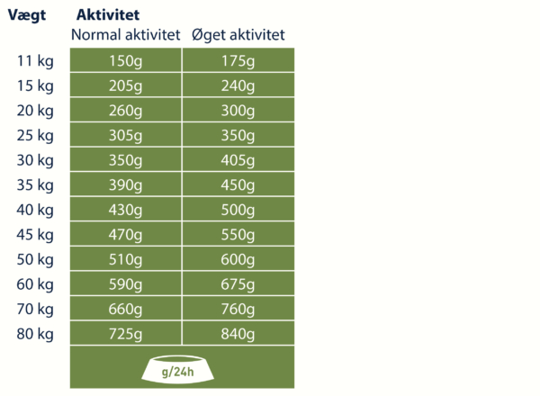 Giv foderet tør eller tilføj frisk, varmt vand (ved omkring 50-60° C) og lad det trække i et par minutter. Sørg for, at der er frisk drikkevand til rådighed på alle tidspunkter. Reducer mængden af foder, hvis du også giver din hund snacks/godbidder. I betragtning af forskellen mellem de enkelte hunde, kan den angivne daglige mængde reduceres med op til 15 %, hvis hunden har tendens til at være overvægtig.