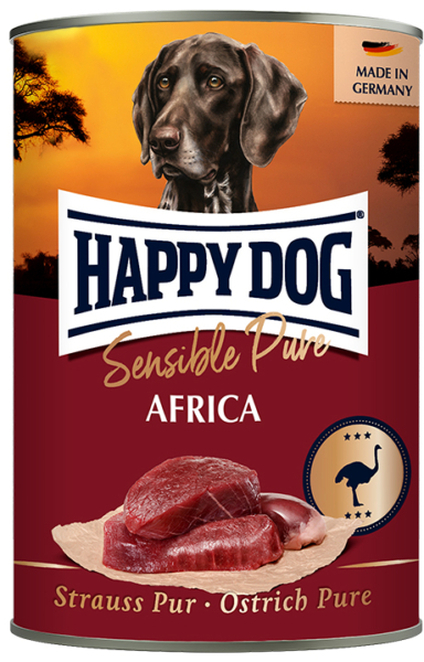 Ren nydelse af animalsk protein fra struds – til ægte kødelskere. Fremstillet i Tyskland af 100% kød og animalske biprodukter fra struds. Indeholder ingen kornprodukter og er fremstillet uden tilsat sukker. Anvendelsen af struds som eneste kilde til animalsk protein, gør den særlig velegnet til fodring af sensible hunde. Sensible Pure Africa kan bruges som fuldfoder eller i kombination med Happy Dog flagefoderblanding eller Happy Dog tørfoder.