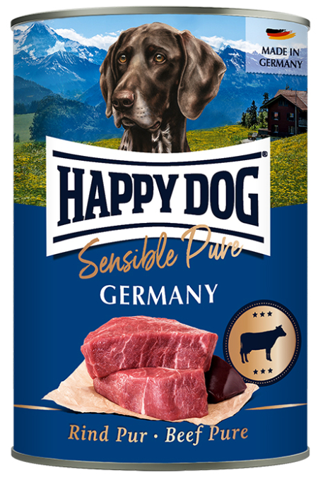 Fremstillet i Tyskland af 100 % kød og animalske biprodukter fra okse. Indeholder ingen kornprodukter og er fremstillet uden tilsat sukker. Anvendelsen af oksekød som eneste kilde til animalsk protein, gør den særlig velegnet til fodring af sensible hunde. Sensible Pure Germany kan bruges som fuldfoder eller i kombination med Happy Dog flagefoderblanding eller Happy Dog tørfoder.