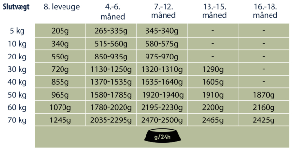 Bemærk: Mængden af foder bør justeres gradvist, indtil den anbefalede fodermængde for følgende aldersgruppe er nået. Efterhånden som slutvægten er nået, falder energibehovet, og mængden af foder skal tilpasses efter foderanbefalingerne. Vej hvalpene regelmæssigt og dokumenter deres vægtudvikling. Det kan være nødvendigt at justere mængden af foder individuelt. Fodre ikke for meget – vær opmærksom på den moderate vækst. Ved tilsætning af snacks bør fodermængden reduceres tilsvarende. Fordel den daglige foderration på flere måltider (3-4).Fodres ved stuetemperatur. Sørg for, at der altid er frisk drikkevand til rådighed.