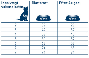 Mængden af ​​foder skal tilpasses kattens individuelle stofskifte og skal muligvis justeres i moderate mængder. Katten skal altid have frisk vand til rådighed. Bemærk ved blandet fodring: 100 g vådfoder ≈ 20 g tørfoder