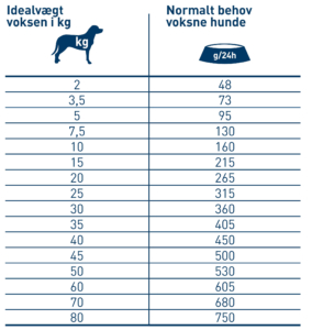 Mængden af foder skal tilpasses hundens individuelle stofskifte og skal muligvis justeres i moderate mængder. Hunden skal altid have frisk vand til rådighed.