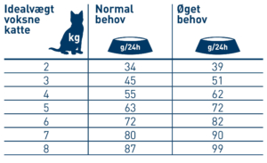 Mængden af foder skal tilpasses kattens individuelle stofskifte og skal muligvis justeres i moderate mængder. Katten skal altid have frisk vand til rådighed. Ved blandet fodring bemærk: 100 g vådfoder ≈ 29 g tørfoder