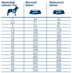 Mængden af ​​foder skal tilpasses hundens individuelle stofskifte og skal muligvis justeres i moderate mængder. Hunden skal altid have frisk vand til rådighed. Bemærk ved blandet fodring: 100 g vådfoder ≈ 30 g tørfoder